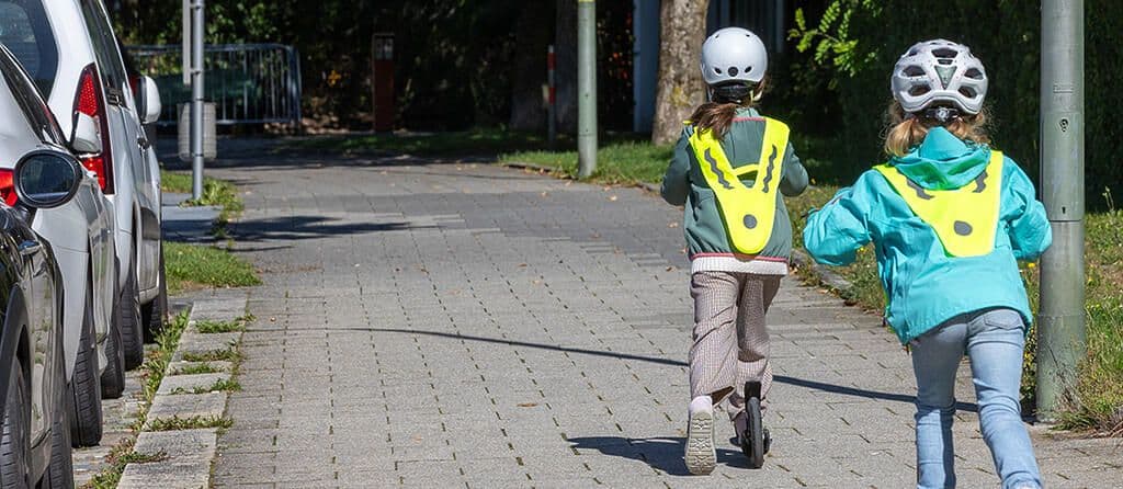 - Wenn Ihr Kind einen Sicherheitsüberwurf trägt, sehen es andere Verkehrsteilnehmerinnen und Verkehrsteilnehmer deutlich besser.